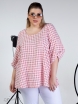 Элегантная блуза-туника свободного силуэта выполнена из натуральной ткани с рисунком в клетку. Ткань обладает легким «крэш» - эффектом. Модель с втачным объемным рукавом, длиной 3/4. Нижняя часть рукава оригинально оформлена за счёт отрезной перекрученной детали. Линия горловины округлой формы. Это модная и оригинальная модель, которая выполнена с учетом особенностей фигуры полных дам и позволяет подчеркнуть их шарм и индивидуальность.